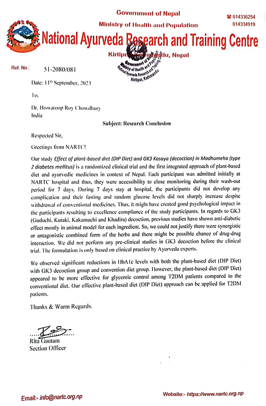 Ministry of Health, Nepal Govt. Clinical Trial on DIP Diet